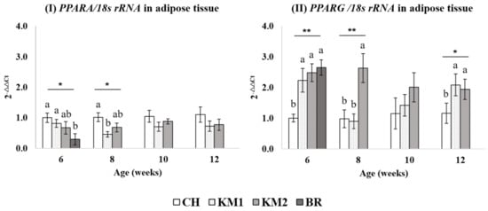 Abdominal fat and breast muscular tissue were investigated for PPARG gene expression level for breed comparison as shown in Figure 2II and Figure 3II. Abdominal fat PPARG gene expression in BR, KM1, and KM2 breeds had higher mRNA expression levels (p < 0.05) than CH breed but not found different expression level among BR, KM1, and KM2 at 6 weeks of age. At the 8th week of age, CH and KM1 had similar mRNA expression but both had lower PPARG expression (p < 0.05) when compared with KM2. At 12 weeks of chicken age, the results show that the PPARG expression of the CH breed was less than (p < 0.05) in both crossbred breeds of chicken.