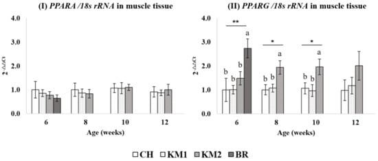 In the P. major, PPARG expression was higher (p < 0.05) in BR compared to the other breeds at 6 weeks of age, however, there were no differences among CH, KM1, and KM2. At 8 and 10 weeks of age, PPARG expression was higher in KM2 compared to KM1 and CH and the differences between CH were not significant.