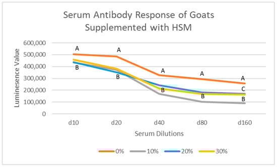 Serum antibody response of goats supplemented with varying levels HSM on day 60 of feeding period. Letters A, B, and C denote statistical significance between treatments at respective dilutions.