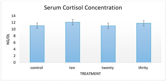 HSM at all supplemented levels had no effect on IL-4 concentrations determined by ELISA in serum samples collected on day 60 of the feeding period (Table 7). Serum IL-6 concentrations increased linearly (p = 0.01), while TNF-α decreased linearly (p = 0.01) with the increasing level of HSM supplementation (Table 7). Serum IL-2 concentrations were higher in goats supplemented with HSM at 10% and 30% levels but were lower at 20% level compared to that of nonsupplemented control groups; however, these results were not statistically significant (p = 0.08; Table 7). Serum cortisol concentrations determined by ELISA in serum samples collected on day 60 remained relatively constant for all treatments demonstrating no significant differences (Figure 2).