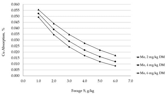 Molybdenum is an essential trace element required by all animals; however, cattle requirements for Mo are not defined. Nonetheless, the current maximum tolerable concentration of Mo for cattle is 5 ppm. Although reports of Mo deficiency are very rare [6], the antagonistic impact of Mo on Cu metabolism has been recognized for many years and is exacerbated by S. This interaction occurs through the creation of ruminal thiomolybdates formed when molybdate reacts with sulfide, produced by rumen microorganisms via the reduction of sulfate. Consequently, thiomolybdates associate with solid rumen digesta (bacteria, protozoa and undigested feed particles) forming insoluble complexes with Cu, therefore reducing Cu absorption and potentially leading to deficiency [20,86]. Equations have been developed to aid in the determining the impact of Mo and S on Cu status of cattle [110]. Although these tools are helpful, the complex mineral-to-mineral interactions in ruminants preclude nutritionists from fully understanding these relationships. Using equations derived from Agricultural Research Council [111], Gordon Carstens (Texas A&M University) prepared a hypothetical dataset which illustrates the impact of dietary Mo and S on the efficiency of Cu absorption (Figure 1).