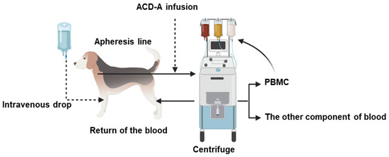 Priming the system of the apheresis machine with normal saline followed by autologous blood is necessary to ensure hemodynamic stability during PBMC collection. Therefore, two weeks before the experiment, about 200 mL autologous blood (20 mL/kg) was collected from each dog in a sterile blood-collection bag with acid–citrate–dextrose formula A (ACD-A, Terumo BCT) and kept at 4 °C until the day of apheresis. Before this sampling, the dogs were sedated with atipamezole 10~20 µg/kg (Nippon Zenyaku Kogyo Co., Fukushima, Japan) and awakened with medetomidine 10~20 µg/kg (Nippon Zenyaku Kogyo Co., Fukushima, Japan). The food was withheld from all dogs 12 h before the apheresis process, while water was provided ad libitum. On the day of apheresis, to customize the length of the PBMC apheresis process, individual data (HCT%, body weight, height ≥ 80 cm, and gender) were collected to establish each dog’s total blood volume (TBV) and its optimal pump rates considering the flow rate of the anticoagulant (AC) [33].