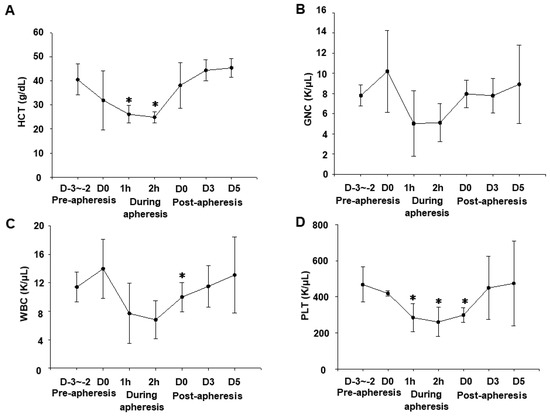 The transition of the values of hematocrit (HCT), granulocytes (GNCs), white blood cells (WBCs), and platelets (PLTs) in dogs. Blood samples were taken from the cephalic vein in pre-apheresis (day (D)-3~2), during apheresis (1, 2 h), and post-apheresis time (D0, 3, 5). Values of HCT (A), GNC (B), WBC (C), and PLT (D) were analyzed. Data were shown as mean ± S.E.M (n = 3). ∗ p < 0.05 vs. D-3~-2 pre-apheresis.