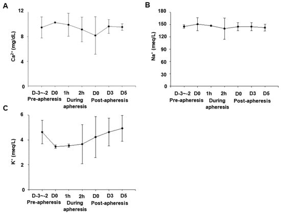 Since the ACD-A solution, which was used as AC during blood flow to the apheresis machine, returns to the body with the blood, it can possibly chelate the blood calcium and cause hypocalcemia. Additionally, we used saline to maintain the blood flow and blood pressure during general anesthesia. Therefore, we monitored serum concentrations of calcium (Ca2+), sodium (Na+), and potassium (K+) pre-, during, and post-apheresis. There were no significant changes in their normal levels as shown in Figure 3A–C, respectively. These data indicate that the apheresis process did not affect the level of these important electrolytes in the blood of these dogs.