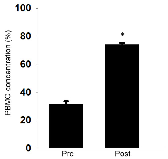 Collection efficacy of PBMCs by apheresis. PBMC concentration pre-apheresis (Pre) and post-apheresis (Post) was calculated. Results were expressed as mean ± S.E.M (n = 3). ∗ p < 0.05 vs. Pre.