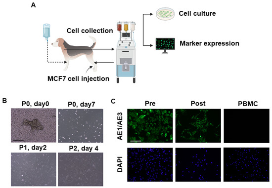 Cancer cell collection by apheresis in dogs. Schematic illustration of MCF7 injection, collection, culture, and characterization (A). Representative phase-contrast images of MCF7 cells after collection by apheresis (n = 2). Scale bar: 100 μm (B). Representative fluorescence images of epithelial cell marker, AE1/AE3 expression in MCF7 cells pre- and post-apheresis as well as in dog PBMC cells. Scale bar: 100 μm (C).