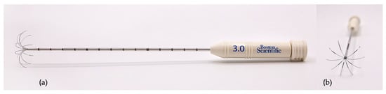 Thermoablation was performed with an RF 3000 Radiofrequency Generator (Boston Scientific, Malborough-ma, MA, USA) with a LeVeen Needle Electrode (Boston Scientific, Malborough-ma, MA, USA), with an umbrella-like deployment configuration (Figure 1), whose diameter and length were based on the depth and size of the cardiac mass to be ablated [,].