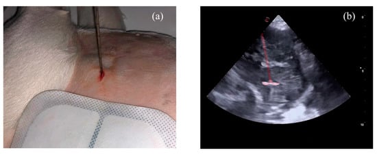 At the end of the procedure, the electrode was removed, and the dog was awakened. Cyanoacrylate tissue adhesive (3M VetBond, 3M Deutschland GmbH, Neuss, Germany) was applied to close the point of entry of the electrode in the skin. Dogs were hospitalized and monitored with ECG and TFAST ultrasonography [] before being discharged. Clinical and echocardiographic follow-up examinations were carried out one (T1), three (T2) and six months (T3) after the procedure. All the echocardiographic examinations before, during and after the procedure were performed by the same operator (P.G.O.) with several years’ experience in ultrasonography, cardiology, and ultrasound-guided procedures. For each dog the echo settings were kept constant during all the examinations in order to better appreciate the changes in ultrasonographic appearance.