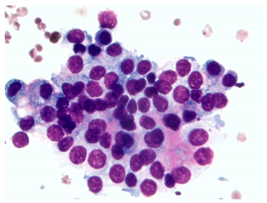 During echocardiographic examination, sporadic arrhythmic events were observed in two dogs, and included isolated premature complexes of ventricular (dog 3) and supraventricular origin (dog 2). Abdominal ultrasonography and thoracic X-rays showed no evidence of metastasis. In all cases, cytological results showed abundant naked nuclei with a neuroendocrine pattern. Intact cells had rounded edges and a light blue cytoplasm with round to oval nuclei with nucleoli. Anisocytosis and anisokaryosis were mild, and the ratio nucleus/cytoplasm was moderate. The cytological characteristics were compatible with CD (Figure 3).