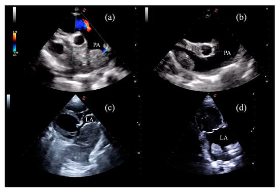 Sonographic appearance before and after the procedure. (a) patient 1 before RFA; (b) patient 1 after 180 days; (c) patient 3 before RFA showing left atrial invasion; (d) patient 3 after 180 days. LA (left atrium), PA (pulmonary artery).