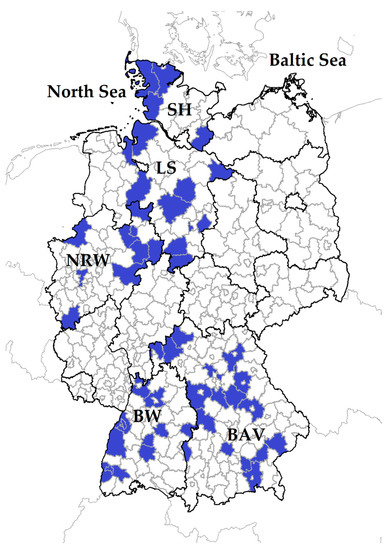 In total, 71 small ruminant flocks were sampled in five German federal states: Schleswig-Holstein: SH; Lower Saxony: LS, North Rhine-Westphalia: NRW, Baden-Wuerttemberg: BW, Bavaria: BAV. Districts with participating farms are coloured in blue.