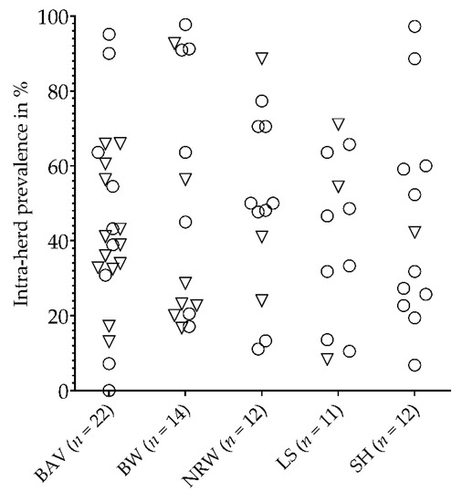 Intra-flock prevalences of antibodies to Anaplasma spp. of 71 small ruminant flocks from five German federal states: BAV = Bavaria, BW = Baden-Wuerttemberg, NRW = North Rhine-Westphalia, LS = Lower Saxony, SH = Schleswig-Holstein. ○ = pure sheep flock. ▽ = mixed sheep and goat flock.