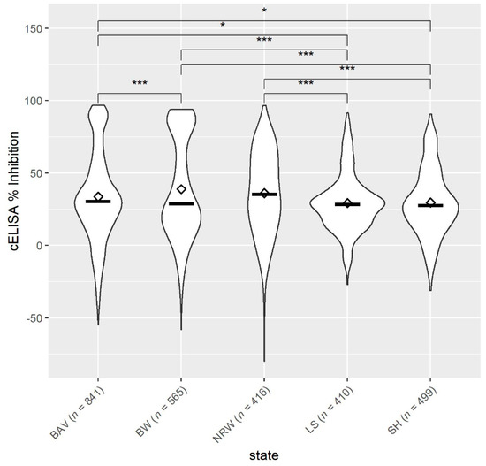 Mean ◊ and median—values of antibodies to Anaplasma spp. from sheep (n = 2731, 71 flocks) located in five German federal states: BAV = Bavaria, BW = Baden-Wuerttemberg, NRW = North Rhine-Westphalia, LS = Lower Saxony, SH = Schleswig-Holstein. * p < 0.05. *** p < 0.001.