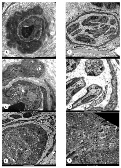 Using TEM, the proanagen phase was identified by the hair follicle rudiments which were visible and surrounded by the cells of the ORS (Figure 2A,B). The elongation zone contained undifferentiated keratinocytes (Figure 2C,D). TEM revealed that the IRS consisted of three concentric layers which is the typical ultrastructure of anagen secondary hair follicle (Figure 2E–H), including Huxley’s layer and Henle’s layer, which was the outermost layer (Figure 2F,G).