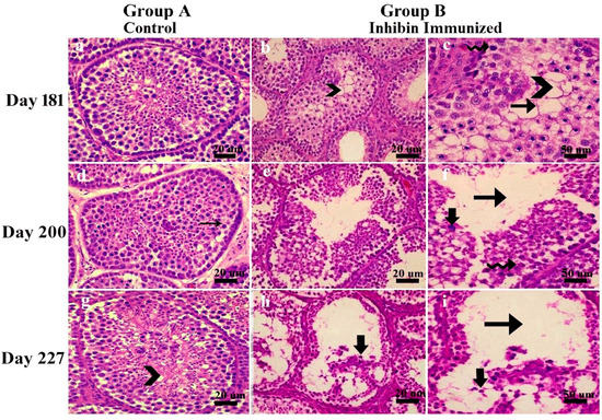 Morphological changes in seminiferous tubules showed a marked difference in testes’ histological features of the control and experiment groups. In the control group, ST was filled with germ cells at all days of age, i.e., 181, 200, and 227, and spermatogenesis seemed normal, while in INH immunized group, testes histoarchitecture and germ cells seemed abnormal. ST was classified according to the following apoptosis criteria in Yangzhou ganders at 181, 200, and 227 days of age as shown in Figure 1. Sections were blindly evaluated.