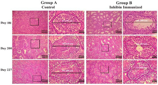 Apoptosis is a normal physiological phenomenon during testis steroidogenesis, and in seasonal breeder birds, seasonality in breeding enhances apoptosis rate [20,21,22,23]. In our previous findings, immunization against INH α subunit in Yangzhou ganders elevated anti-INH antibody titer after each INH followed by booster immunizations on 181, 200, and 227 days of age [10]. From these findings, we can observe testis atrophy, resulting in apoptotic testicular histoarchitecture after each INH immunization. These two concomitant phenomena seem to be linked, as the anti-INH antibody tire is low in the control group with normal spermatogenesis.