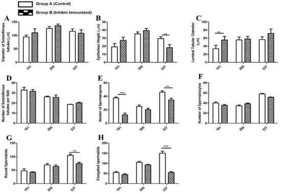 Histological diagrams in Figure 2 show a method of measuring ST diameter, epithelial heights (EH1, EH2) and luminal tubular diameter (LD). Graphs in Figure 2A–H show numbers of germ cells and ST diameter. There is a positive correlation among ST diameter, epithelial heights, and LT diameter in all experimental days in both groups. Similarly, the number of spermatogonia, spermatocytes, and round and elongated spermatids is higher in control group A than the INH immunized group. Particularly on day 227, when the testes are fully matured, germ cell numbers (spermatogonia and spermatids) are significantly higher in group A than group B, while ST/field is inversely proportional to other histological measurements.