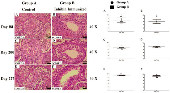 Images of histological sections on days 181 (A,B), 200 (C,D) and 227 (E,F) showing seminiferous tubules at different stages of spermatogenesis by the Johnsen score. Scale bar 20 μm at 40× magnification. (A–F) Graphical representation of the Johnsen score on days 181, 200 and 227 at a 95% confidence interval. Scale bar = 20 μm. Each group n = 30. ● Group A (Control) and ▪ Group B (Inhibin Immunized). Dots and squraes in Graphs (A–F) representing 10 birds each in both groups while Y axis shows Jonhsons score (0–10).