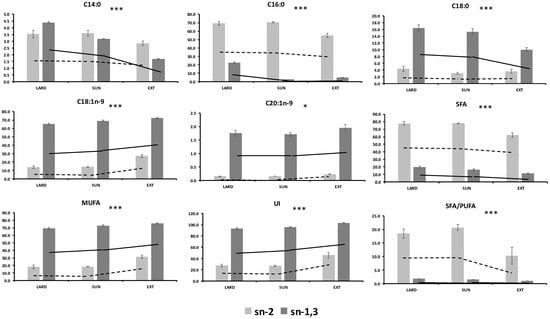 Interaction Treatment × Position of main fatty acid positional distribution. * (p < 0.05); *** (p < 0.0001) of the interaction Treatment × Position. LARD: Iberian × Duroc (IB × DR) pigs reared indoors and fed with lard as a fat source. SUN: IB × DR pigs reared indoors and fed on a diet containing high-oleic sunflower oil (115 g/kg of diet). EXT: IB × DR breed pigs free-range reared and exclusively fed on acorns and grass according to the traditional feeding system. sn-2 (in 2-position of triglyceride), sn-1,3 (average of 1- and 3-position of triglyceride). SFA (saturated fatty acids) = C14:0 + C15:0 + C16:0 + C17:0 + C18:0 + C20:0, MUFA (monounsaturated fatty acids) = C16:1n-7 + C17:1 + C18:1n-9 + C10:1n-9, UI (unsaturation index) = [(C16:1n-7 + C17:1 + C19:1n-9 + C20:1n-9) + 2 × (C18:2n-6) + 3 × (C18:3n-3 + C20:3n-6) + 4 × C20:4n-6].