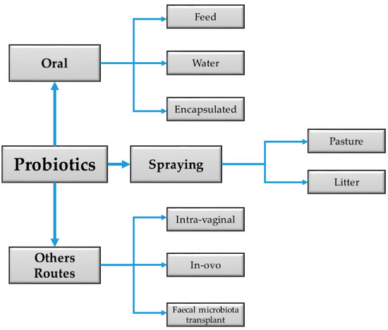 Probiotics preparations come in various forms, and their efficacy sometimes varies depending on whether they are mono- or multistrain. The new approach in probiotics utilization has been to use a combination of probiotics strains. This strategy is presumed to have highly influenced animal nutrition, exerted increased health benefits, and created an even more favorable balance of intestinal metabolism, animal welfare [13], and performance than single-strain cultures [14]. They can be administered via several routes (Figure 1), but the oral method is most common in animal husbandry.