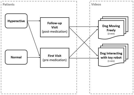 - Bleuer-Elsner, S.; Zamansky, A.; Fux, A.; Kaplun, D.; Romanov, S.; Sinitca, A.; Masson, S.; van der Linden, D. Computational Analysis of Movement Patterns of Dogs with ADHD-Like Behavior. Animals 2019, 9, 1140. [Google Scholar] [CrossRef]