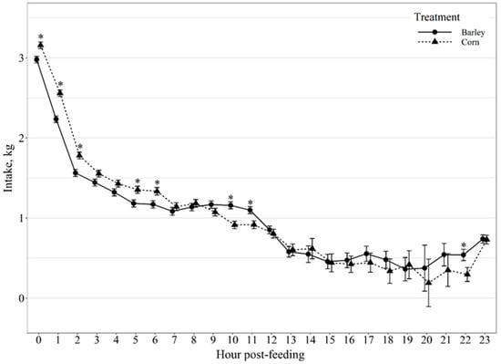 Diurnal dry matter intake patterns of beef steers fed once daily (0800) barley- or corn-based feedlot diets. Intake was influenced by diet × hour post-feeding interaction (p < 0.01) and differences (p ≤ 0.05) within hour post-feeding are denoted by *.