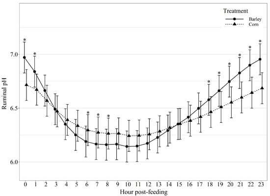Diurnal pH patterns of beef steers fed once daily (0800) barley- or corn-based feedlot diets. Ruminal pH was influenced by diet × hour post-feeding interaction (p < 0.01) and differences (p ≤ 0.05) within hour post-feeding are denoted by *.