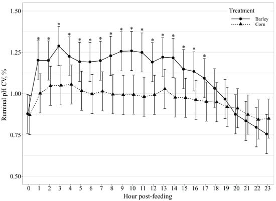 Diurnal pH coefficient of variation (CV, %) patterns of beef steers fed once daily (0800) barley- or corn-based feedlot diets. Ruminal pH CV was influenced by diet × hour post-feeding interaction (p < 0.01) and differences (p ≤ 0.05) within hour post-feeding are denoted by *.