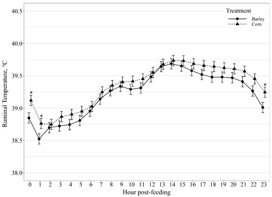 Diurnal ruminal temperature (°C) patterns of beef steers fed once daily (0800) barley- or corn-based feedlot diets. Ruminal temperature was influenced by diet × hour post-feeding interaction (p < 0.01) and differences (p ≤ 0.05) within hour post-feeding are denoted by *.