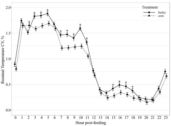 Diurnal ruminal temperature coefficient of variation (CV, %) patterns of beef steers fed once daily (0800) barley- or corn-based feedlot diets. Ruminal temperature CV was influenced by diet × hour post-feeding interaction (p < 0.01) and differences (p ≤ 0.05) within hour post-feeding are denoted by *.