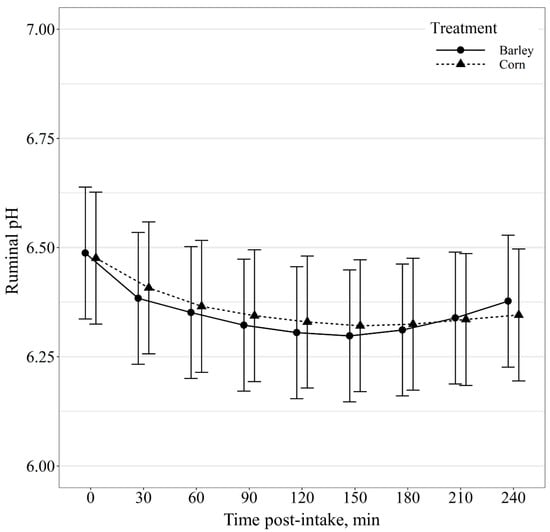 Previous research has reported a strong correlation between feed intake of feedlot cattle and the lowest daily ruminal pH on the previous day []. Yang et al. [] observed that ruminal pH was higher in cows fed a corn-based diet compared to barley throughout the early portions of the day post-feeding. However, the magnitude of difference in ruminal pH between barley and corn-based diets were relatively small [,]. In our study, both corn- and barley-fed steers exhibited the majority of daily intake the first 12 h post-feeding, with corn-fed steers consuming or tending to consume more feed than barley-fed steers within the first 6 h post-feeding; however, barley-fed steers consumed more feed than corn-fed steers at hour 10 and 11 post-feeding and immediately prior to the next feeding event at 22 h. Additionally, we found a diurnal difference in ruminal pH between barley and corn-fed steers in which ruminal pH was higher in barley-fed steers 0 and 1 h post-feeding, as well as, 18–23 h post-feeding and lower than corn-fed cattle at hour 6, 7, and 8 post-feeding. Thus, the ruminal pH for barley-fed steers had greater daily ruminal pH declines compared to corn-fed steers. Previous research has found that cattle consuming high levels of barley alter feeding behavior in a manner that reduces the risk of acidosis []. These findings suggest that animals may adjust their intake when pH is low, presumably in an attempt to limit consumption of fermentable carbohydrates and restore pH conditions to a more comfortable level []. This may explain why diet had an effect on diurnal ruminal pH patterns but was not a factor influencing ruminal pH post-intake event out to 240 min.