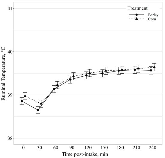 Previous research has demonstrated ruminal temperature to be a reliable measure of body temperature in both dairy cows and beef steers [,]. Thus, monitoring ruminal temperature could aid in detecting adverse health events in cattle []. Additionally, a correlation has been observed between rumen temperature and pH [,]. The strength of this relationship, however, appeared to be influenced by diet composition and individual animal variability []. In the current study, rumen temperature responded similarly in both barley and corn-fed cattle apart from the hour before and after feeding. There was no difference in ruminal temperature post-intake events between barley and corn-based diets. However, for steers fed barley- or corn-based diets, rumen temperatures declined 30 min post-intake event. Rumen temperatures are impacted by other factors such as water intake [,]. Presumably, the reduced temperatures observed 30 min post-intake could be due to cattle consuming water after feeding. Previous research has predicted watering events based on ruminal temperature change recorded with rumen boluses; however, this comes with a large margin of error []. Therefore, the relationship of rumen pH and temperature with water intake and intake behavior warrants further investigation.