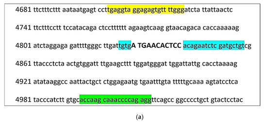 Schemes of DNA tests for MSTN polymorphisms genotyping. (a) Scheme of nt821(del11) MSTN genotyping test system: in yellow—forward primer (MSTNF), in green—reverse primer for the amplification of the wildtype allele (MSNTRn), in blue—reverse primer for the amplification of the mutant allele (MSTNRm). The 11 bp deletion is indicated by the capital letters in bold; (b) Scheme of F94L MSTN genotyping test system: in yellow—forward primer (F94LF), in green—reverse primer (F94LR). Restriction site for TaqI endonuclease is indicated by arrow.