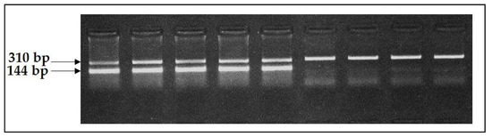 As nt821(del11) polymorphism was an 11 bp deletion, the test system for the diagnostics of this mutation was based on the AS-PCR method, allowing the simultaneous amplification of wildtype and mutant alleles. For the implementation of the technique, three oligonucleotide primers were designed: one forward (MSTNF) for the amplification as a wildtype and as a mutant allele, and two reverse, one of them (MSTNRn) with the connection with the MSTNF-generated DNA fragment of 310 bp responding to the wildtype allele, and the other (MSTNRm) with the MSTNF-generated mutant allele of 144 bp. Therefore, the animals free from the mutation showed only one DNA fragment of 310 bp on gel electrophoresis; the animal carriers of the nt821(del11) mutation showed two DNA fragments of 310 and 144 bp on gel electrophoresis (Figure 2); and the animals homozygous on the nt821(del11) mutant allele, which in our investigation was not found, presented with only one DNA fragment of 144 bp on gel electrophoresis.