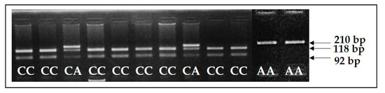 As F94L polymorphism is the SNP, the test system for the diagnostics of this polymorphism was based on the PCR-RFLP method. The recognition site was found in the wildtype allele of F94L MSTN for TaqI restriction endonuclease. Therefore, after amplification and TaqI digestion, the wildtype allele representing the healthy animal was restricted on two DNA fragments of 118 and 92 bp. The mutant allele that does not enter the restriction site rested without changes and showed only the DNA fragment of 210 bp on gel electrophoresis. The heterozygous animals having in their genotypes wild type C-allele and mutant A-allele (CA genotype) showed three DNA fragments of 210, 118, and 92 bp on gel electrophoresis (Figure 3).
