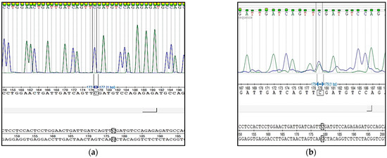 Results of the Sanger sequencing of PCR products of F94L MSTN genotyping: (a) animal free from the mutation (CC genotype); (b) heterozygous animal (CA genotype).