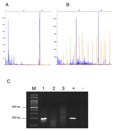 Fragment analyses showed the blue peaks at 191 bp representing the size of the amplified env fragment in sample ID #28983 (A) and sample ID #873/03 (B). (C) The 2% Agarose gel electrophoresis of PCR products with target size of 191 bp. (M): molecular weight marker; (1): ID #28983; (2): ID #259; (3): ID #873/08; (+) positive control; (−) negative control.