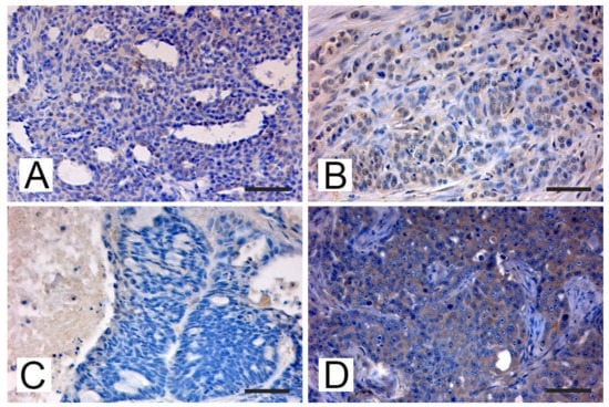 Cat. Mammary gland. Immunohistochemical expression of p14 MMTV env protein: (A) FMC # 84589 from Pisa, tubulopapillary carcinoma. Weak cytoplasmatic immunostaining in some neoplastic epithelial cells (bar = 50 μm); (B) FMC #873/08, from Bologna, tubulopapillary carcinoma. Diffuse medium intense cytoplasmic and nuclear staining was detected in some neoplastic epithelial cells that were arranged cords and tubular structures and showed moderate to severe anisocytosis and anisokaryosis, with margination of the chromatin and prominent nucleoli. Mitoses are also present (bar = 50 μm); (C) FMC # 259/00, from Bologna, ductal carcinoma. Scattered weak cytoplasmic staining was detected in some epithelial cells arranged in cords and tubules surrounding lumina showing anisocytosis and anisokaryosis (bar = 50 μm); (D) FMC #28983, from Bologna, tubulopapillary carcinoma. Diffuse intense cytoplasmic staining of neoplastic cells arranged in tubular and papillary structures showing significant anisocytosis and anisokaryosis, margination of the chromatin and large central prominent nucleoli. Several atypical mitoses are detectable (bar = 50 μm).