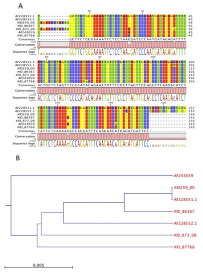 - Thompson, J.D.; Higgins, D.G.; Gibson, T.J. CLUSTAL W: Improving the sensitivity of progressive multiple sequence alignment through sequence weighting, position-specific gap penalties and weight matrix choice. Nucleic Acids Res. 1994, 22, 4673–4680. [Google Scholar] [CrossRef] [PubMed]