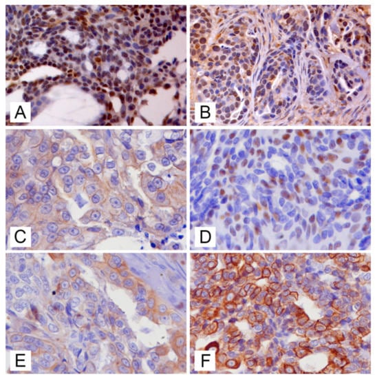 Feline mammary carcinomas (FMCs), immunohistochemistry for molecular phenotyping: (A) nuclear labelling for anti-oestrogen receptor (OR) antibody in a OR+ FMC (bar = 50 μm); (B) positive nuclear labelling for anti-progesterone receptor (PR) antibody in a PR+ FMC ((bar = 50 μm); (C) immunolabelling of membrane for anti-c-erbB2 antibody in a 2+ c-erbB2 FMC (bar = 50 μm); (D) nuclear immunolabelling for anti-p63 antibody in a p63+ FMC (bar = 50 μm); (E) cytoplasmic immunolabelling for anti-cytokeratin (CK) 5/6 in a CK5/6+ FMC (bar = 50 μm); (F) cytoplasmic immunolabelling for anti-CK14 in a CK14+ FMC (bar = 50 μm).