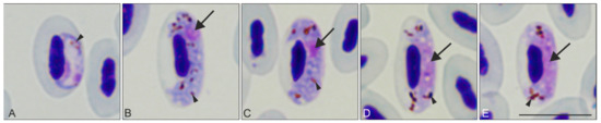 )—pigment granules. Images were taken using Giemsa-stained blood films at ×1000 magnification. Scale bar = 10 μm.