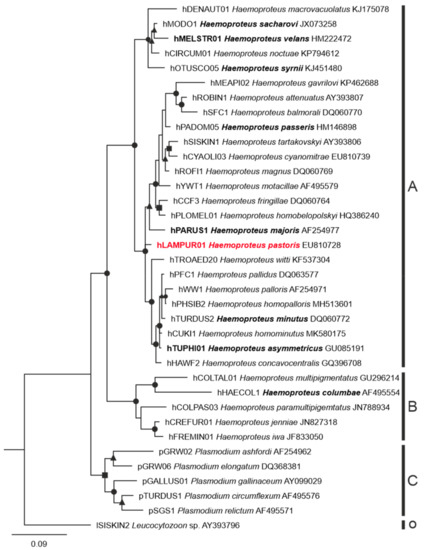 BLAST searches in MalAvi [3] and the NCBI GenBank (https://www.ncbi.nlm.nih.gov/genbank/, accessed on 28 September 2021) database were used for lineage identification using the obtained sequences. The following lineages sequences were retrieved from the GenBank database and used to build the phylogenetic tree: 30 lineages of Haemoproteus species, 6 of Plasmodium species, and 1 of Leucocytozoon species (lSISKIN2, as outgroup). Lineages of morphologically characterized parasites as well as Haemoproteus spp. with described exo-erythrocytic development were incorporated into the analysis for comparative purposes. The software jModeltest-2.1.10 [33,34] was used to select the best-fit model (GTR+G+I), which was run in Geneious with the MrBayes plugin v3.2.6 [35] for 5 million generations, and sampled every 100th generation, while discarding the first 25% of trees as a ‘burn-in’ period for the construction of the consensus tree.