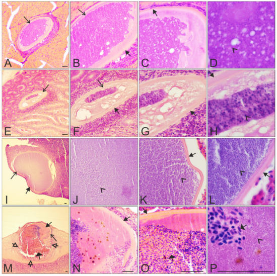 Indeed, the presence of the relatively rigid wall allowed the visualization of the fully ruptured megalomeront, from which merozoites escaped (Figure 3M–P, Figure 4M–P, and Figure 5). These merozoite-empty megalomeronts were full of red blood cells (Figure 5A–I). Due to the capsular-like wall, the ruptured megalomeronts partly maintained their shapes. As the wall surrounding growing megalomeronts is thick, entire, and is of host origin [25], no inflammatory reaction was observed around the parasites before the burst of the megalomeront. In fact, former studies also did not report the presence of inflammatory reaction around megalomeronts [13,21,24]. However, after the rupture of the wall, the merozoites came into contact with the host tissues, and a host response appeared. The latter was readily visible due to development of bleeding and prominent blood portions filling the megalomeront through the parts where the wall had broken (Figure 3M–P, Figure 4M–P, and Figure 5D–I) [10,11]. Hemorrhage-related processes likely are important pathologies during H. pastoris infection and might occur in haemoproteosis caused by other Haemoproteus spp. From this point of view, avian haemoproteosis might be similar to Leucocytozoon (Akiba) caulleryi hemorrhages caused in domestic chicken [47,50] and, thus, worthy of experimental research. In the case of H. pastoris, completely mature and ruptured megalomeronts were found in the brain, the pancreas, the intestine, the esophagus, and the spleen.