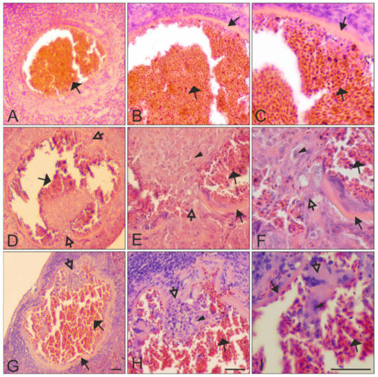 Ruptured mature megalomeronts of Haemoproteus pastoris (lineage hLAMPUR01) in the pancreas (A–C), the intestine (D–F), and the spleen (G–I) of naturally infected Common starlings Sturnus vulgaris. Note that the prominent capsular-like wall was still present after megalomeront maturation and release of merozoites (B,C,E–I), resulting in maintenance of a prominent space, which was invaded with numerous erythrocytes and other blood cells (A–C vs. D–I). Parasites were shown at three different magnifications: A, D, G ×100; B, E, H ×200, and C, F, I ×400. Filled-black triangle arrows (