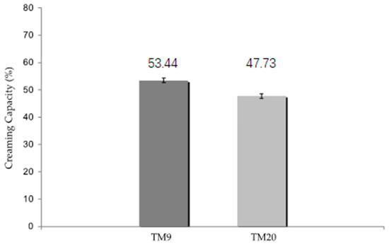 The higher creaming capacity of the milk at 9 °C, with respect to 20 °C, is due to the crystallisation of fat globules and their breaking, with consequent leaking of triglycerides that favours their aggregation in large clusters that tend to surface more rapidly [48].