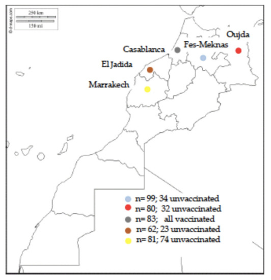 This study was carried out on 405 horses, conveniently sampled and collected between March and May 2018, from 5 regions of Morocco that concentrate the largest population of horses in the north of Morocco and where national studs are located. The distribution of sera according to the sampling location is shown in Figure 1. 163 samples were taken from unvaccinated horses and 242 from horses vaccinated with commercially available inactivated monovalent EHV-1 vaccines. Horses were located in 5 provinces of northern Morocco (i.e., Oujda (n = 80; 32 unvaccinated), Meknes-Fez (n = 99; 34 unvaccinated), Casablanca (n = 83; all vaccinated), El Jadida (n = 62; 23 unvaccinated), and Marrakech (n = 81; 74 unvaccinated)).