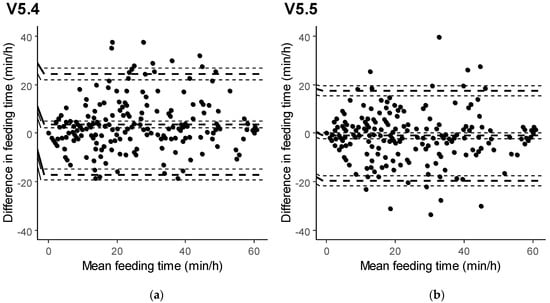 Agreement between the sensor measurements and human observations of feeding time, displayed in Bland–Altman plots (dashed lines indicate bias, upper and lower limits of agreement, each with 95% CI) for software versions 5.4 (a) and 5.5 (b).