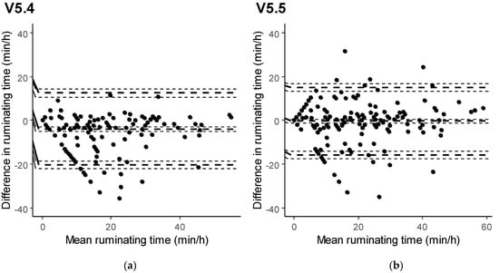 Besides computing mean differences, the Bland–Altman plots showed that, with V5.4, the distributions of the differences between sensor data and visual observations were skewed for both feeding time (Figure 1) and ruminating time (Figure 2). With V5.5 instead, the differences appeared to be symmetrically distributed. Compared with 5.4, the software V5.5 also reduced the critical difference for feeding time as well as for ruminating time. Despite this, the limits of agreement for both feeding and ruminating times remained relatively wide, even with the software V5.5 (Table 3).