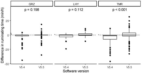 The analysis of the mixed model as regards the difference in ruminating time also showed a significant effect of software version. Overall, the development of V5.5 allowed us to significantly improve the detection of ruminating behavior compared with V5.4 (−0.42 vs. −3.44 min/h; p < 0.001). Type of feed alone did not affect the difference in ruminating time (−2.82, −0.35 and −2.64 min/h for GRZ, LHY and TMR, respectively), but its interaction with the software version produced significant results (Figure 4). Compared to V5.4, the software version V5.5 significantly enhanced the sensor’s accuracy in terms of TMR (−0.12 vs. −5.16 min/h; p < 0.001), but no differences between V5.5 and V5.4 were detected for GRZ (−1.92 vs. −3.72 min/h; p = 0.198) and LHY (0.77 vs. −1.46 min/h; p = 0.112).
