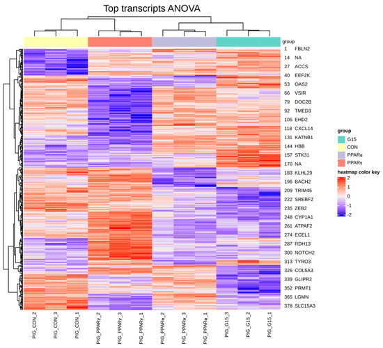 Hierarchical clustering and heatmap of expression profiles for samples and genes (383) with altered expression. Global ANOVA test across PPARα, PPARγ and GPER antagonist-treated groups. (PIG_CON—control group, PIG_PPARα– group treated with PPARα antagonist, PIG_PPARγ—group treated with PPARγ antagonist, PIG_G15group treated with G15 antagonist).